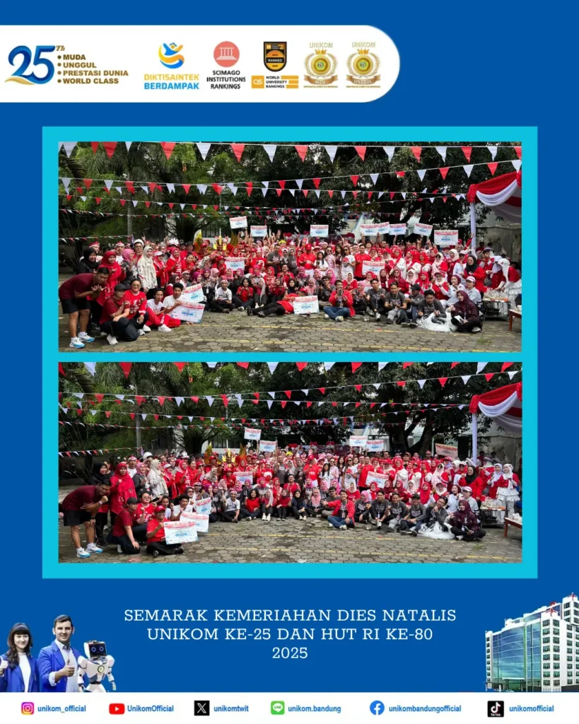 Bandung, UNIKOM – Pada Sabtu, 16 Agustus 2025, suasana meriah menyelimuti Universitas Komputer Indonesia (UNIKOM) dalam perayaan gabungan Dies Natalis UNIKOM ke-25 dan HUT RI ke-80. Acara ini diikuti oleh civitas akademika UNIKOM yang turut serta dalam berbagai kegiatan, termasuk jalan santai dan lomba-lomba seru.