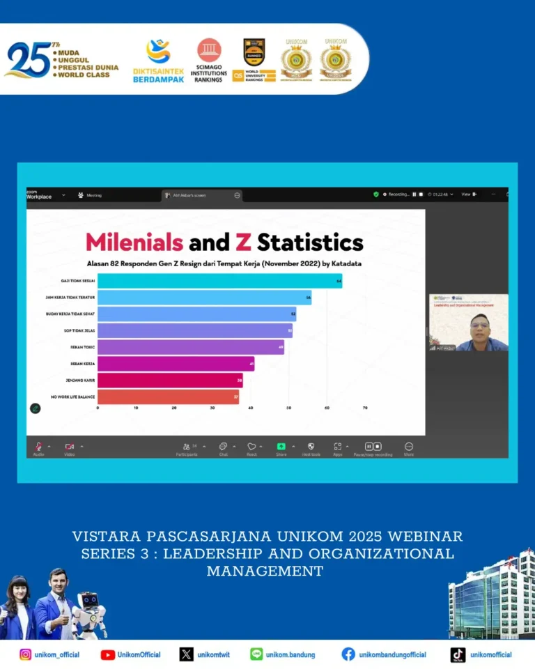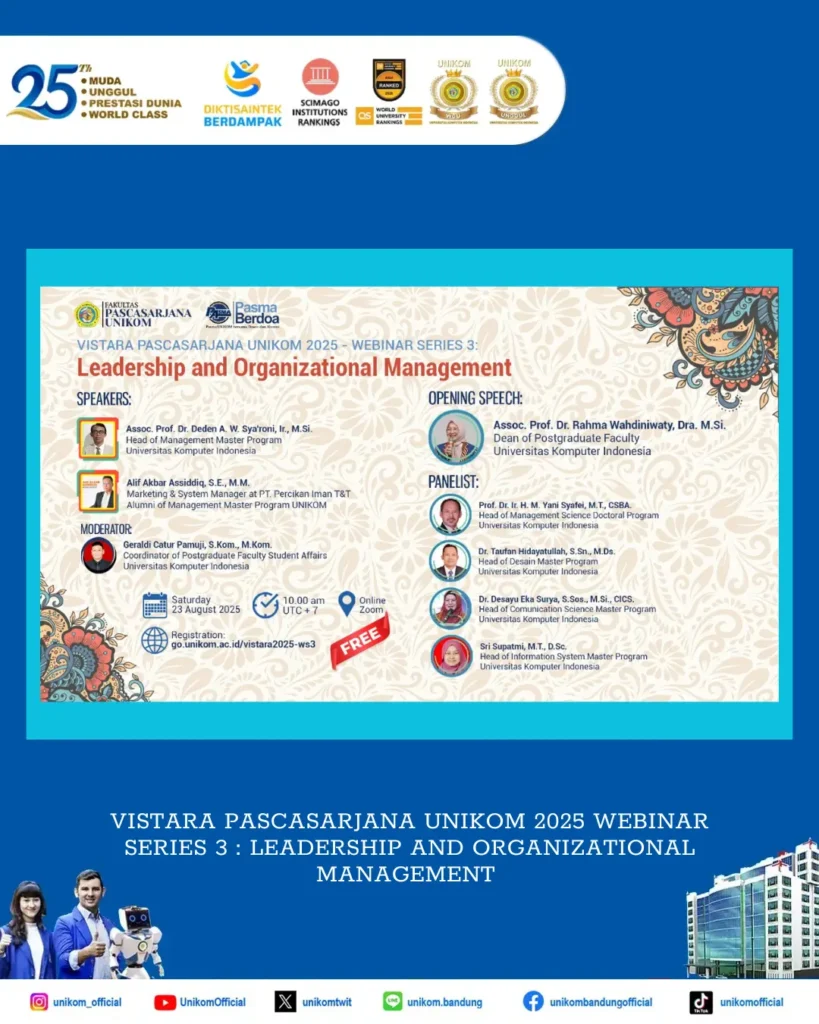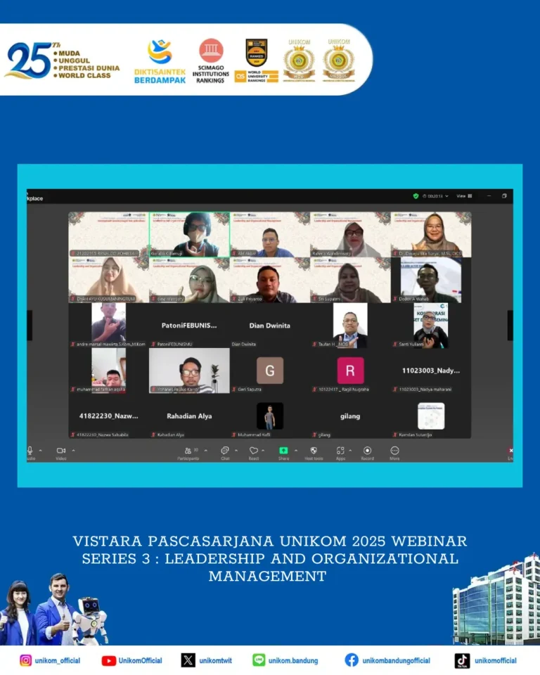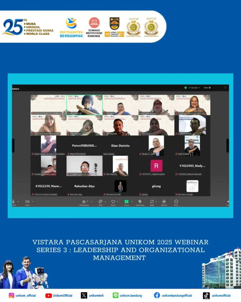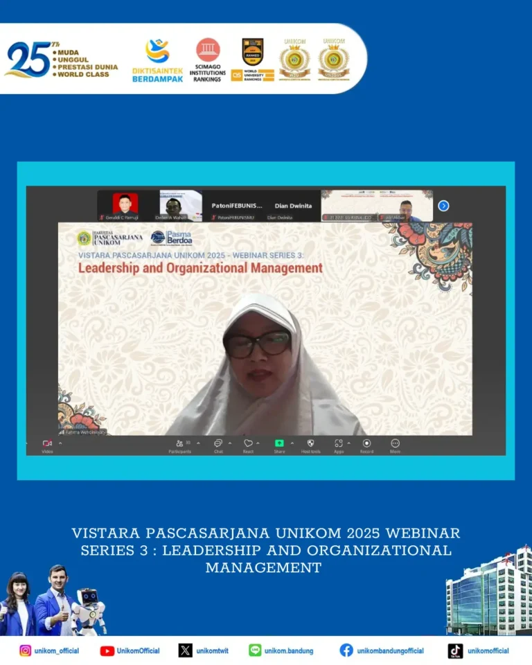 BANDUNG, UNIKOM – Fakultas Pascasarjana UNIKOM bersama PASMA UNIKOM menggelar “Vistara Pascasarjana Unikom 2025 Webinar Series 3 : Leadership and Organizational Management” pada Sabtu, 23 Agustus 2025. Webinar yang diadakan secara daring melalui Zoom meet ini secara resmi dibuka oleh Dekan Fakultas Pascasarjana UNIKOM, Assoc. Prof. Dr. Rahma Wahdiniwaty, Dra., M.Si. Acara ini merupakan salah satu program Fakultas Pascasarjana UNIKOM bersama PASMA UNIKOM dalam mewujudkan Tridharma Perguruan Tinggi.