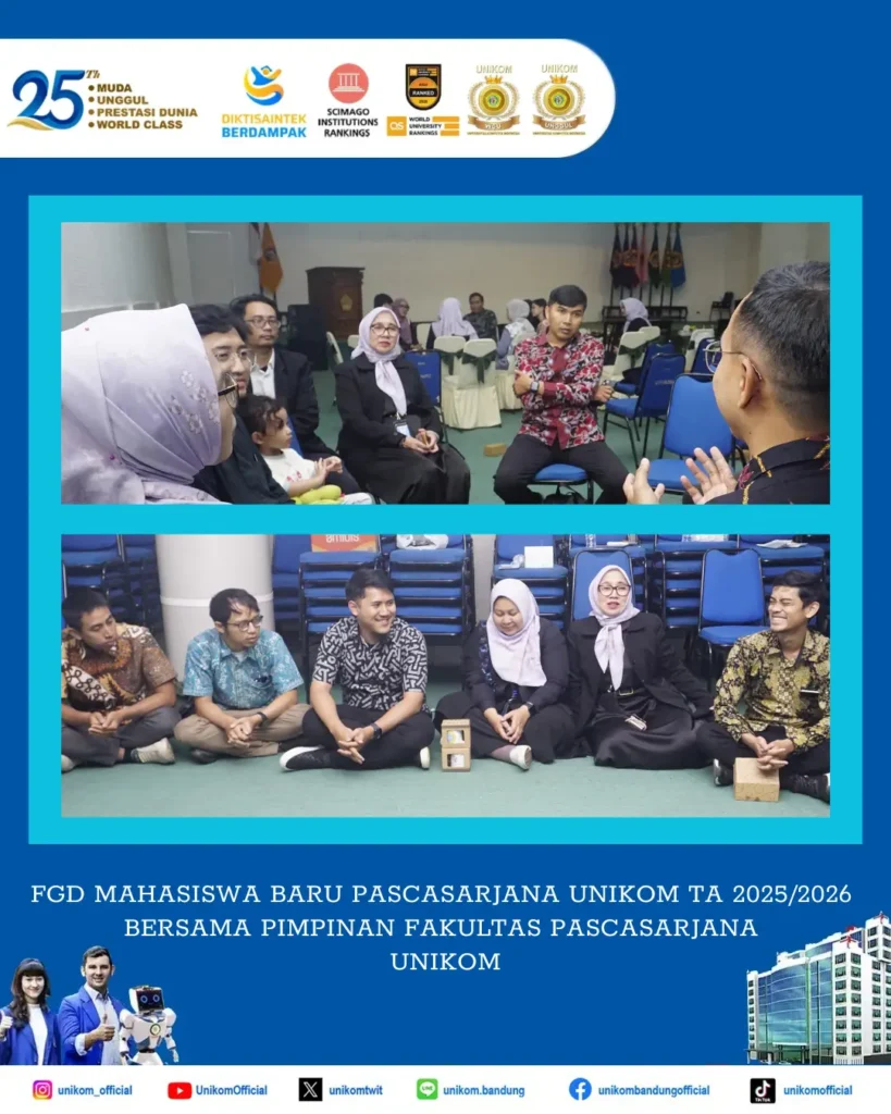 Forum Group Discussion ini merupakan kegiatan diskusi antara Mahasiswa Baru TA 2025/2026 bersama masing – masing Ketua Program Studi, Kakak Tingkat dan didampingi Dekan Fakultas Pascasarjana UNIKOM. Acara ini menjadi wadah dialog interaktif yang secara mendalam membahas seputar Fakultas Pascasarjana UNIKOM dan Program Studi di lingkungan Pascasarjana UNIKOM.